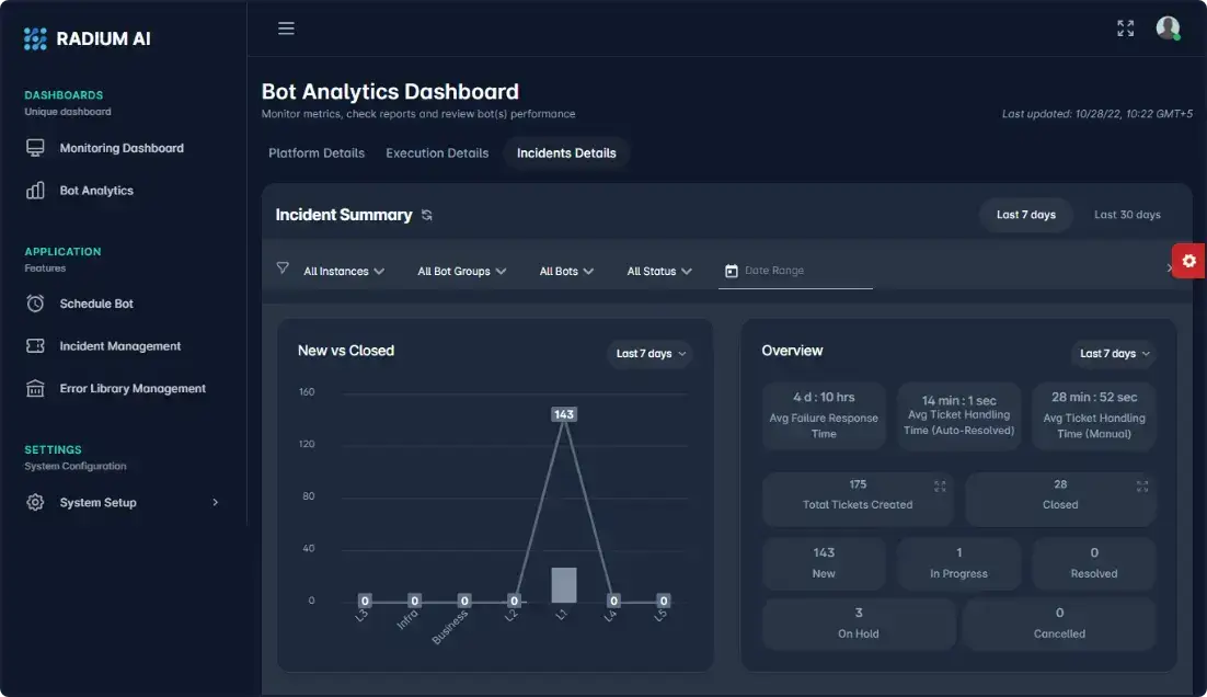 Accurate detections & precise classifications lead to optimal automated solutions. Radium AI not only recommends resolutions to the errors but also has an in-built action library that takes corrective actions.